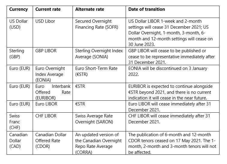On 5 March 2021, the Financial Conduct Authority (“FCA”) (UK regulator) confirmed that all LIBOR settings for all currencies would either cease to be provided by any administrator or no longer be representative from the following dates:
