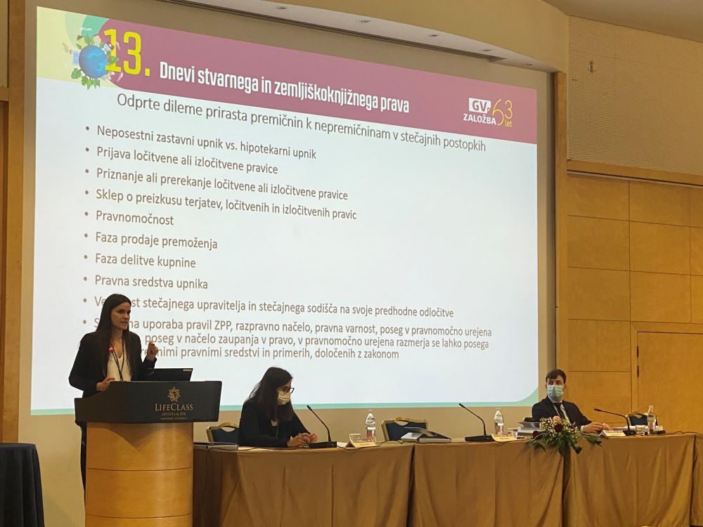 V okviru sekcije na temo stvarnih pravic v postopkih zaradi insolventnosti, ki jo je vodila Petra Plevnik, so predstavili praktične vidike prirasta premičnin k nepremičninam, vpliva začetka stečajnega postopka na obligacijski in stvarnopravni zahtevek upnika in skupnega premoženja zakoncev v stečajnem postopku.
